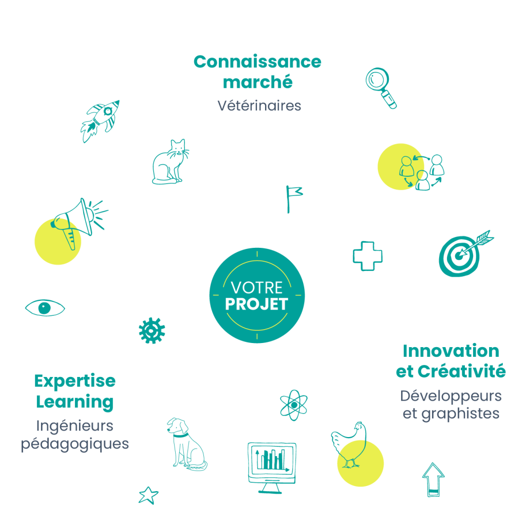 L’équipe associe des professionnels de la santé animale et des experts commerciaux à des spécialistes de l’apprentissage et du développement.