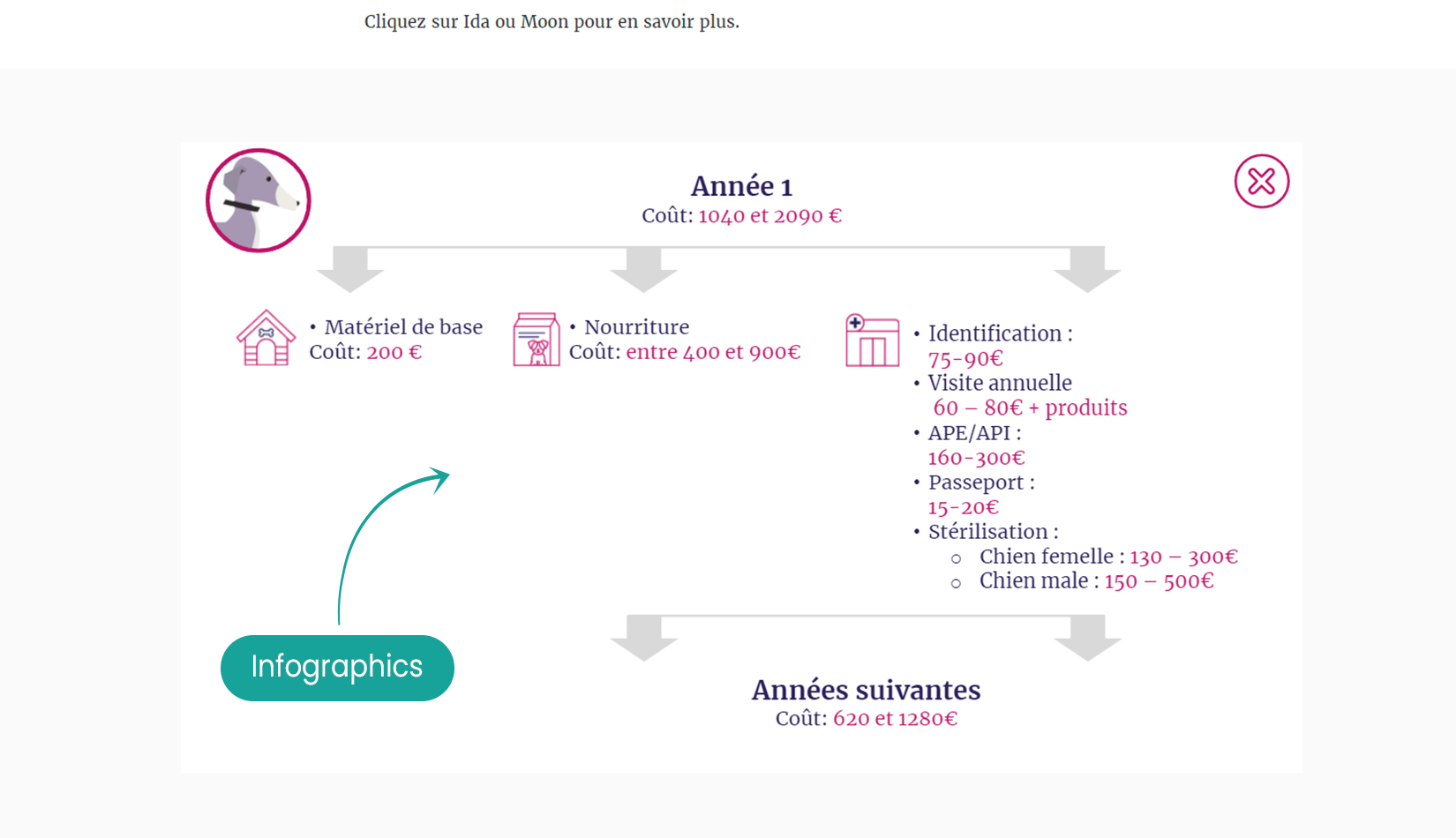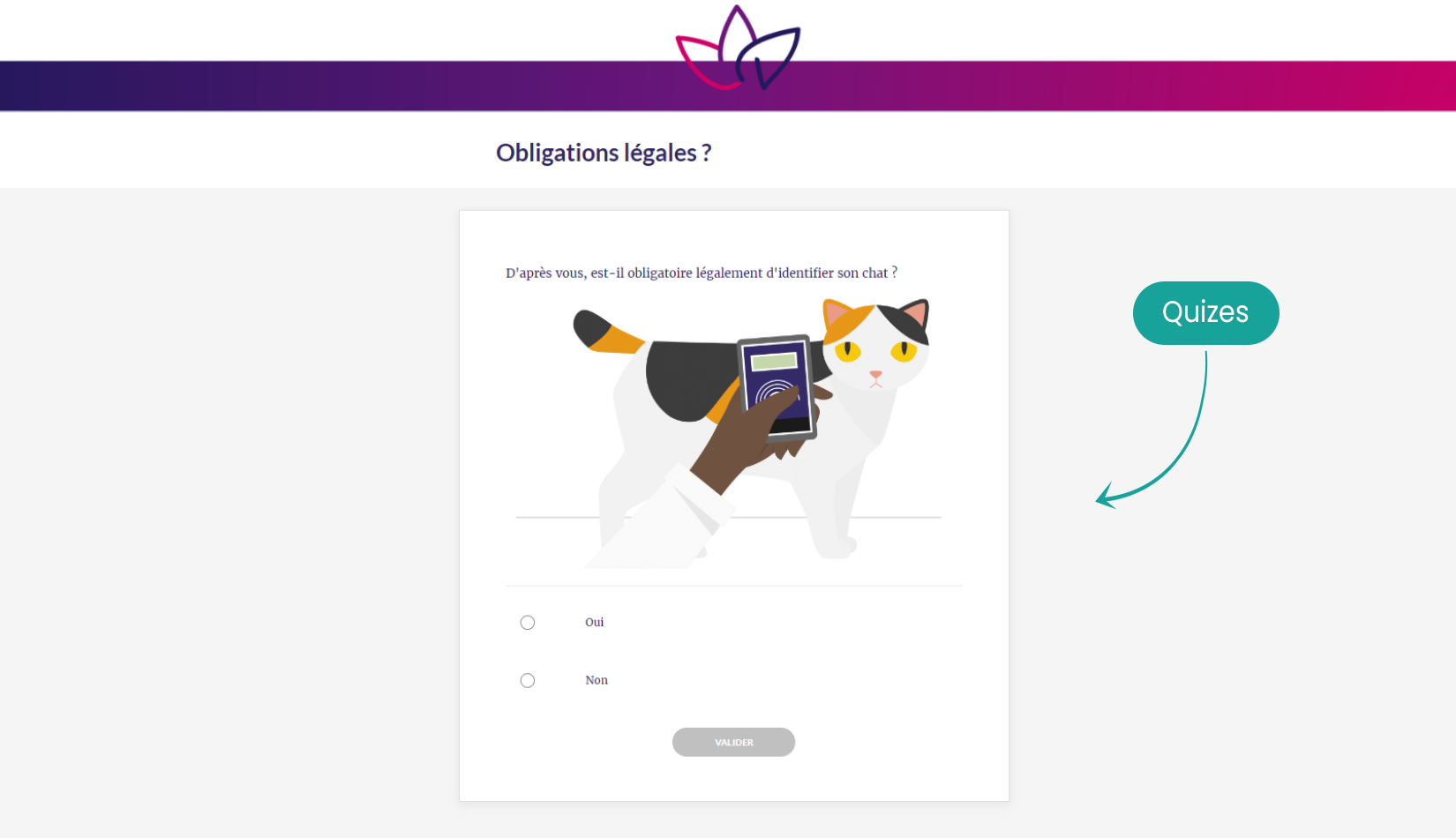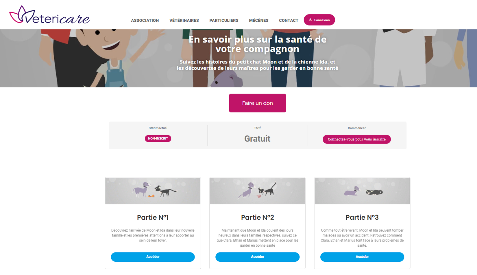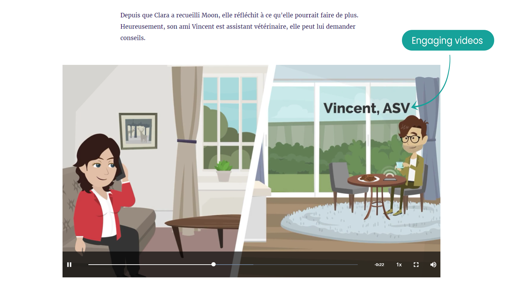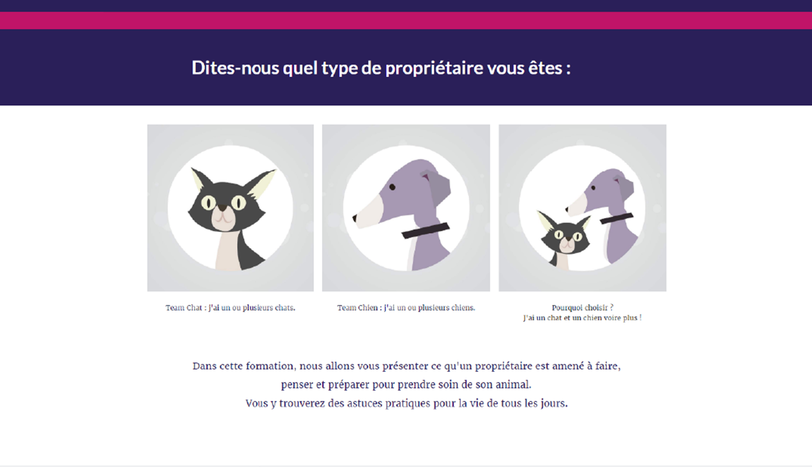 The training consists of three micro-modules including animated videos telling the story of Moon the cat, Ida the dog and their respective families. We follow them and what they have to do or put in place to ensure the well-being of their animals.